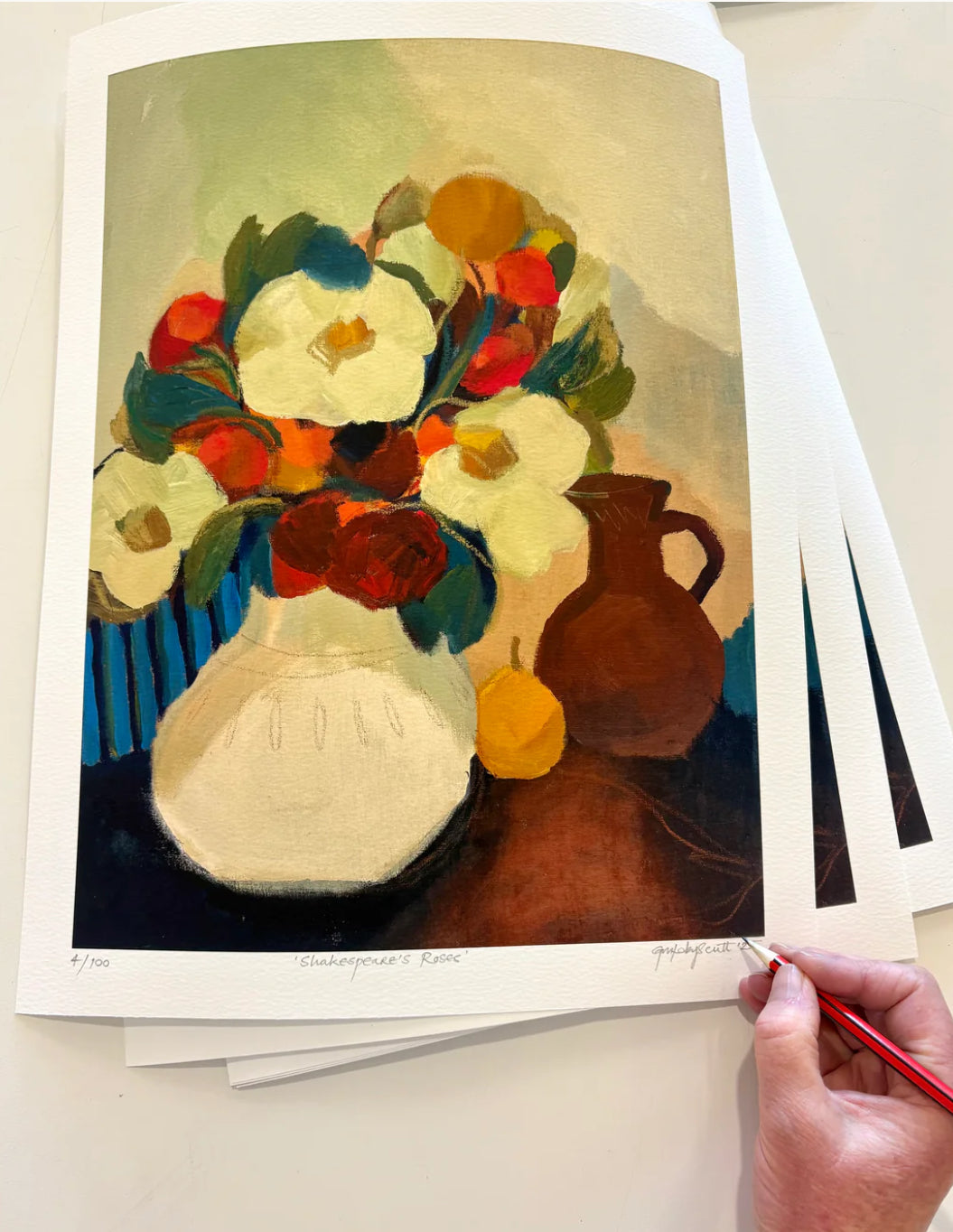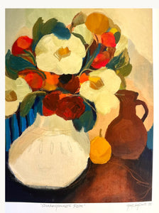 A rich, brightly-coloured floral piece, full of vibrant colour and abundant roses within a lively still life composition.