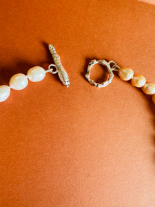 Hand crafted necklace with fresh water pearls and fused silver clasp.