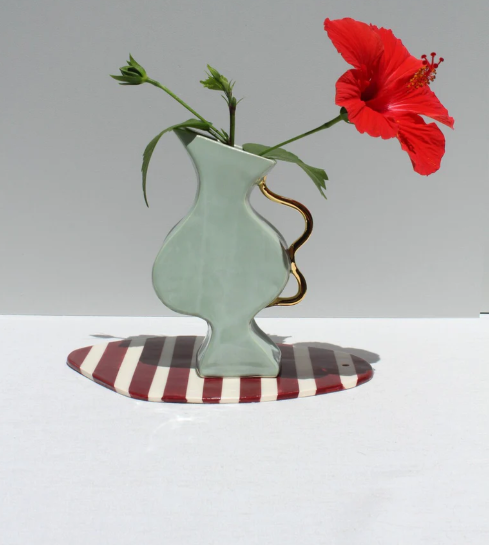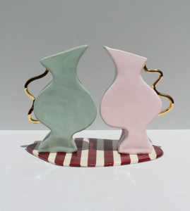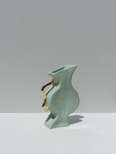 Little Deet in Green and Gold is a study in silhouette and symmetry. Hand-crafted from white clay and glazed in light pink with a 22 Carat gold handle. This vessel has been fired 3 times in the kiln to achieve the beautiful gold handle.