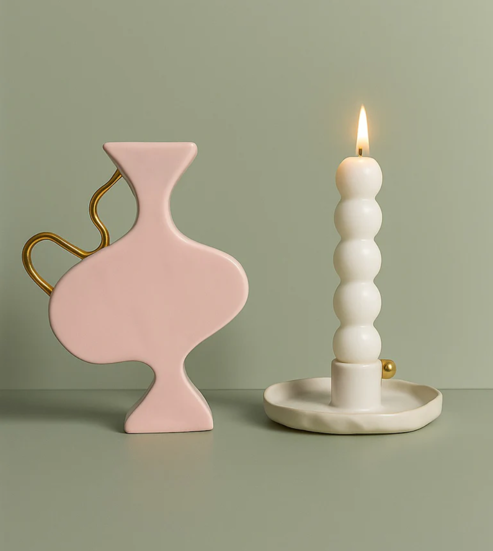 Femme is a limited edition series reflecting the fluid, curvy, arches of the female form. Hand built by artist Susan Christie, this vessel is glazed in light pink gloss glazed with a 22 karat gold wiggle handle.
