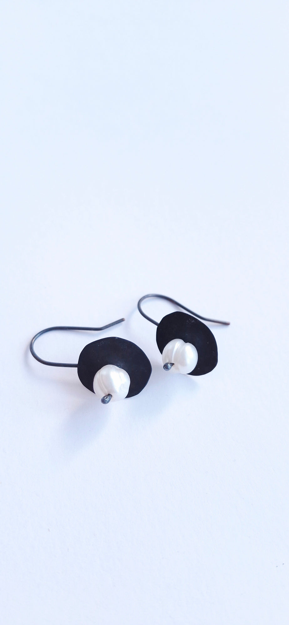 Gorgeous pearl disk earrings with oxidised sterling silver, copper and fresh water pearls.