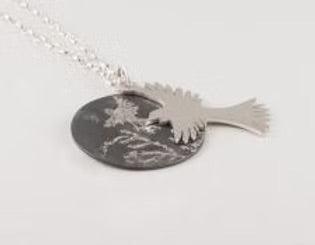 Sterling silver etched Tui disc and sterling silver tui on a 50cm silver chain, by Nelson jeweller Helen Turinsky.